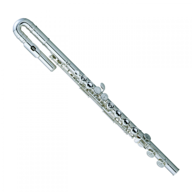 Flauta transversal com cabeça curva, pratos abertos, chaves alinhadas, pano interior e exterior, vareta, estojo e bolsa para o estojo.