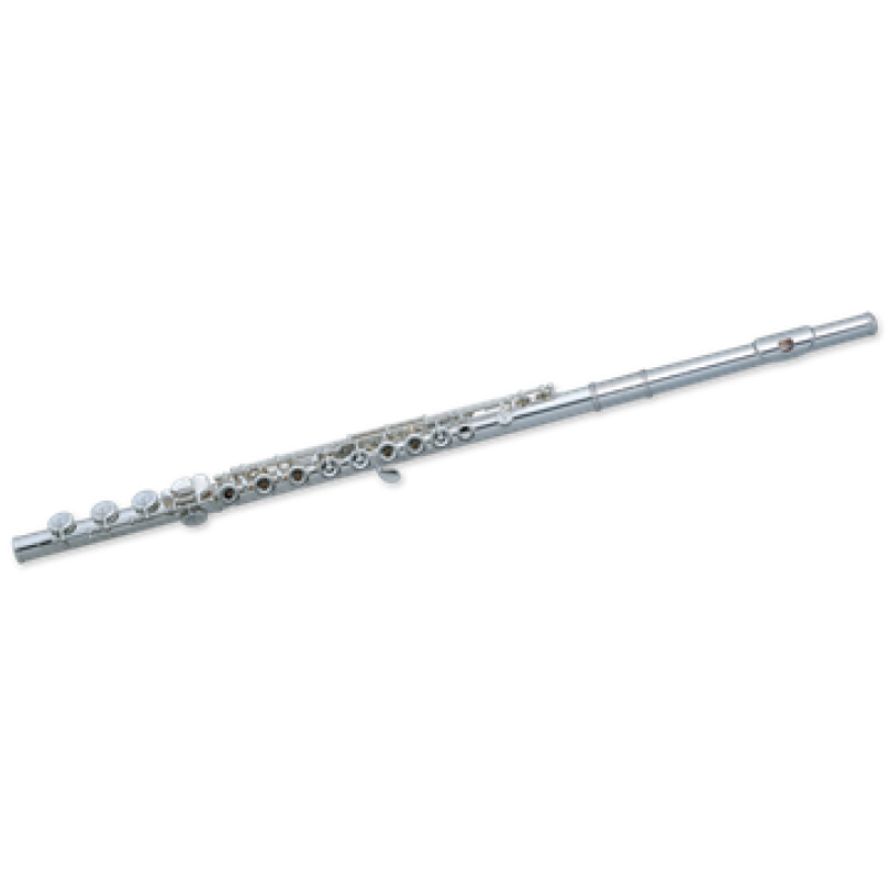 Flauta transversal com cabeça, corpo e pé em prata, pratos abertos, chaves desalinhadas, mecânica de mi, pata de si, pano interior e exterior, vareta, estojo e bolsa para o estojo.