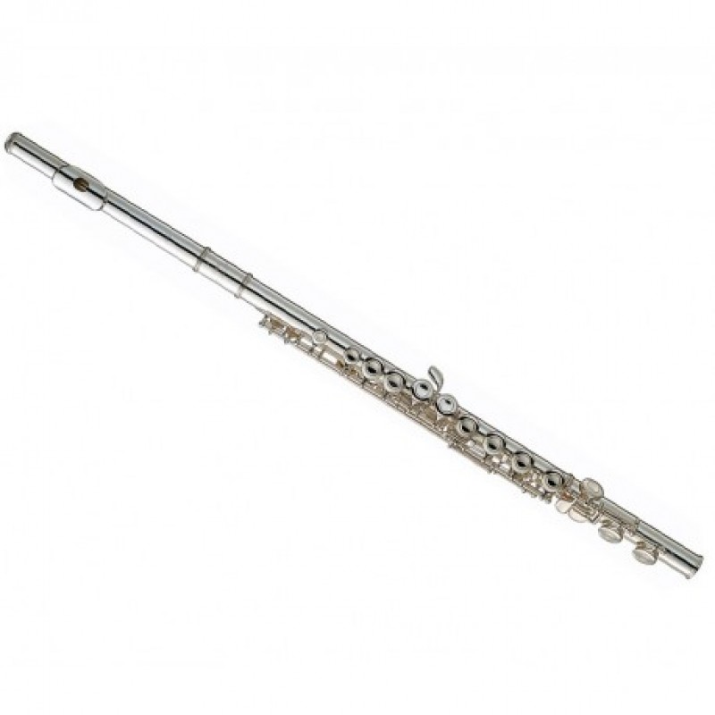 Flauta transversal, pratos fechados desalinhados. Mecanismo de Mi. Acabamento prateado