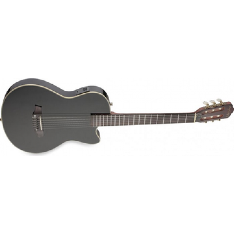 Guitarra clássica electrificada activa, sem caixa, tampo sólido em abeto, escala em rosewood, acabamento preto brilhante.
