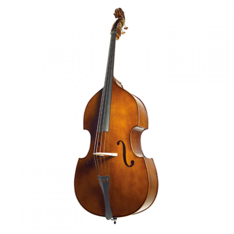 Contrabaixo 4/4. Tampo em abeto. Lados e fundo em bordo laminado. Escala em madeira ebonizada. Carrilhões de quatro peças. Corpo tipo gamba. Acabamento brilhante. Inlcui correias tipo mochila, saco acolchoado com vários bolsos e arco de madeira do Brasil e noz de ébano.