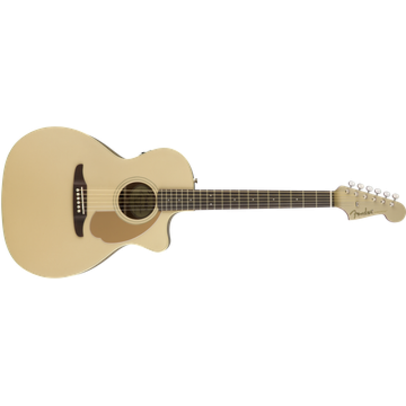 Guitarra com tampo maciço em Sitka Spruce, laterais e fundo em mogno, braço em mogno, escala em Nogueira, pickup Fender/Fishman com afinador, cordas Dura-Tone.