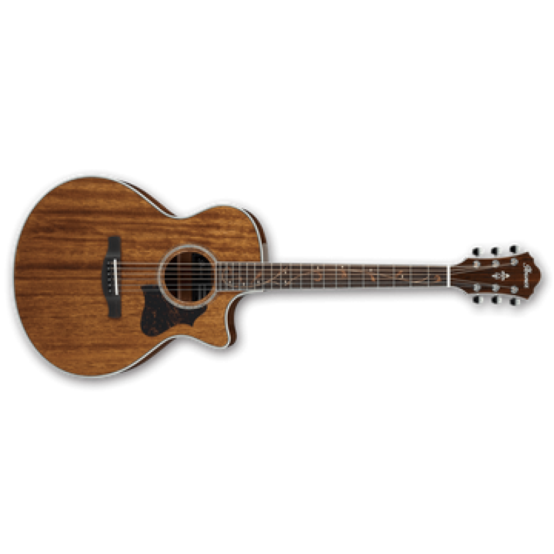 Guitarra acústica elétrificada com tampo sólido em mogno, laterais e tampa traseira em mogno, escala e ponte em pau santo. Pickup T-bar undersaddle. Ibanez Custom. Cordas D'Addario EXP incluídas.