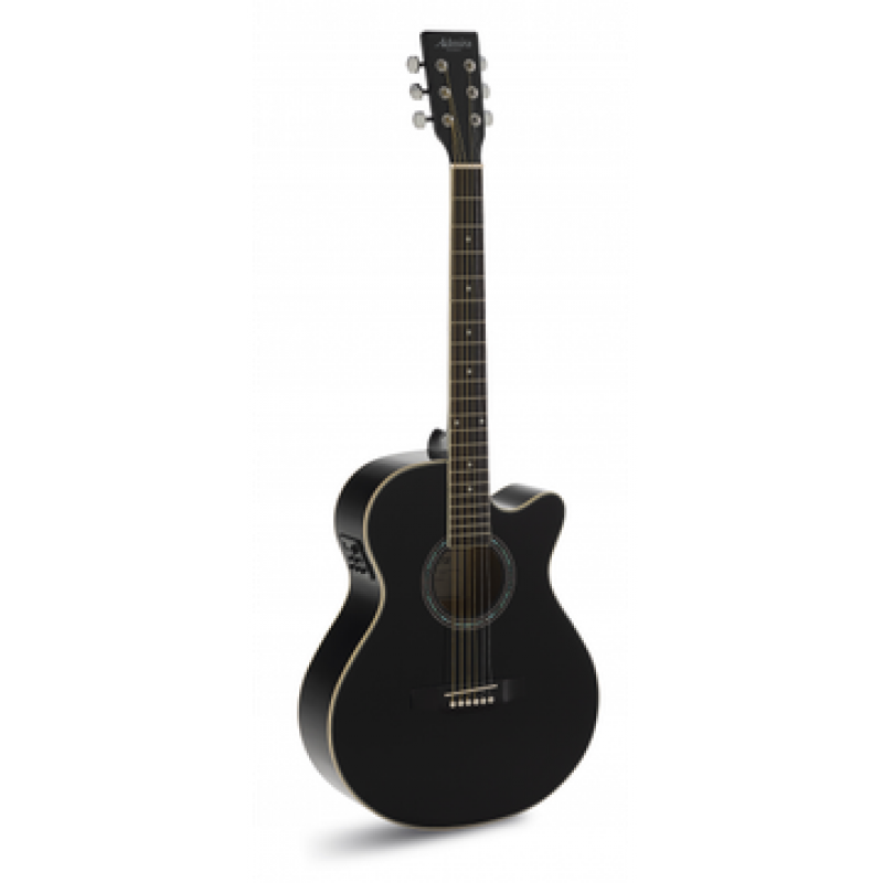 Guitarra Acústica Eletrificada com cutaway, Mini Jumbo. Tampo em abeto, lados e fundo em tília. EQ de 5 bandas com afinador. Acabamento preto acetinado.