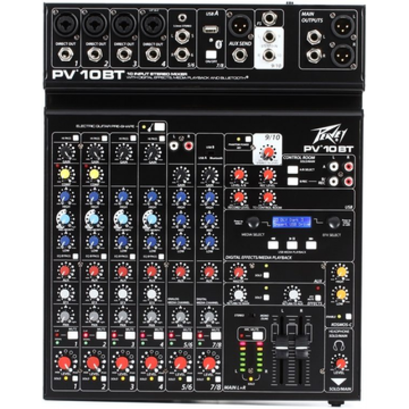 Mesa de mistura, com 10 canais (4 canais mono e 3 stereo), processador de efeitos, interface USB in/out, filtro hi-pass, equalizador de 3 bandas por canal com bypass, compressor em 2 canais, mute, pré-escuta, led de sinal, direct out em 4 canais, saídas control room selecionáveis, saídas main balanceadas XLR, bluetooth 3.0, leitor USB MP3/WAV, entrada Hi-z para guitarra, phantom power, dimensões 33x39x6cm.