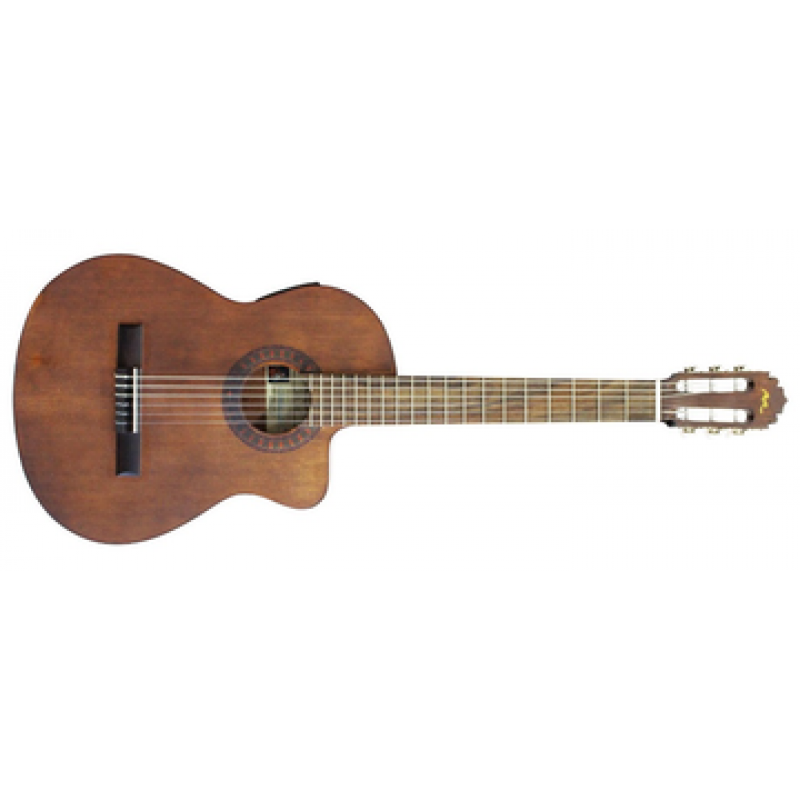Guitarra clássica electrificada, com tampo maciço em Cedro, fundo e laterais em Pauferro, escala em Mongoy, ponte em Pausanto da Índia, braço em Mogno Africano, pestana em osso, cordas Savarez, acabamento Vintage, pickup Fishman.