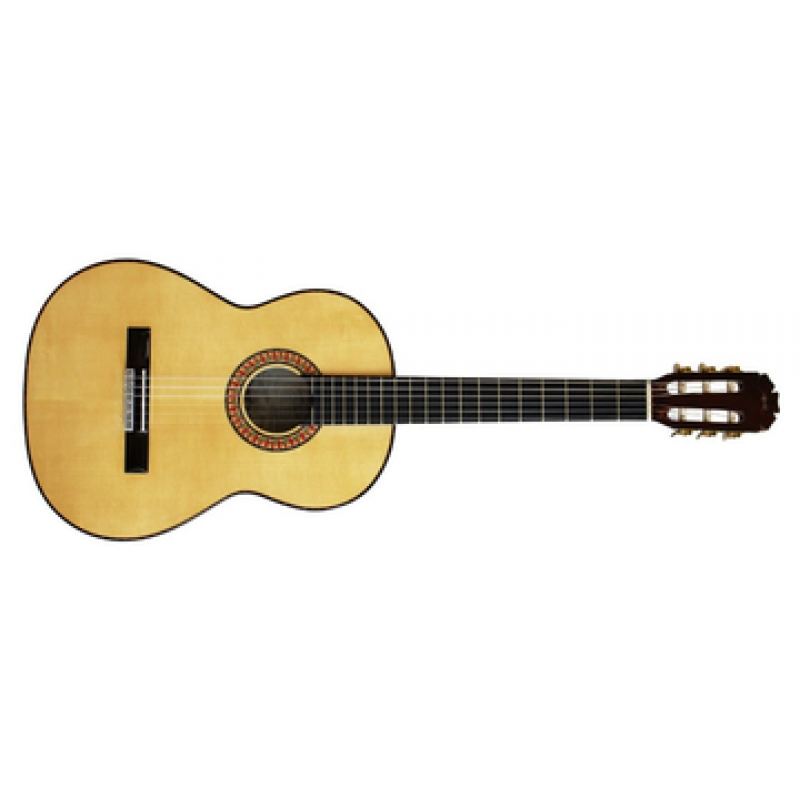 Guitarra clássica de fabrico artesanal com tampo maciço em Cedro ou Abeto, fundo e laterais em Pausanto de Madagascar, escala em ébano, ponte em Pausanto da Índia, braço em cedro com reforço em ébano, sanefa especial, pestana em osso, cordas Savarez, carrilhões dourados, acabamento Brilho, com estojo.