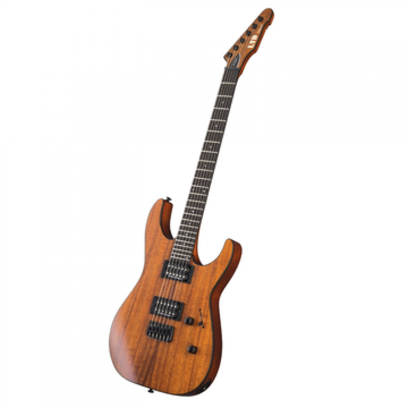 Corpo em mogno com tampo em Koa Havaiana, braço de 5 peças em Mogno e Bubinga thru-body com perfil extrafino plano, escala em ébano de 25,5” com 24 trastes XJ, Carrilhões LTD Locking, ponte Hipshot com dcordas thru-body, pickups Seymour Duncan TB-PG1/SH2, hardware negro, acabamento natural gloss.