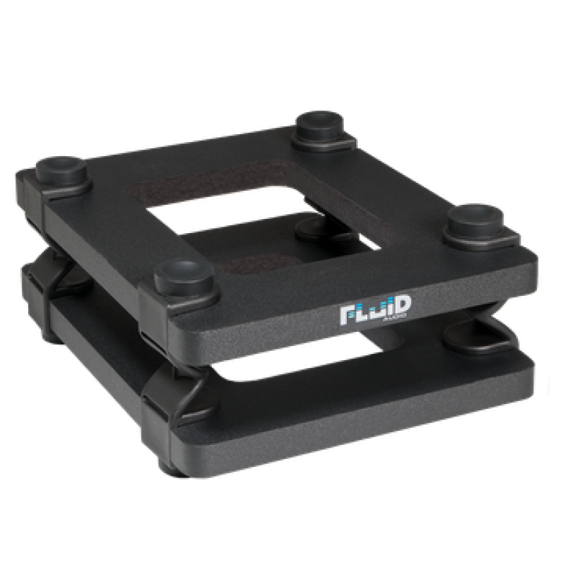 Par de suportes para monitores de estúdio de 4’’ e 5’’, com dois níveis de altura (2,5’’ e 5’’), e três ângulos de posicionamento, com isolamento acústico.