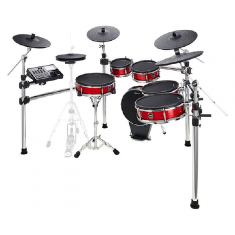 Kit de Bateria Electrónica de 8-Peças com rede no pad bombo, tarola e timbalões. Módulo Strike com 1600 sons, 110 kits, display led a cores de 4,3”, importação de samples wave para cartão 8gb incluído, configuração do módulo através de software de edição, cascos em madeira, pratos com textura martelada, Secção de efeitos, gravador, saídas L+R, 6 saídas directas jack balanceado, saída auscultadores, entrada auxiliar minijack, USB Midi, Midi i/o. Kit composto por 1 pad mesh tarola 14”, 4 pads mesh timbalão de 8+10+12+14”, 1 pad mesh 14” de bombo com pedal, 1 pad 12” choques para suporte choques, 3 pads 14” prato com choke, 1 pad 16” ride de 3 xonas, rack, suporte tarola, cabelagem, baquetas e transformador. Pedal de bombo e suporte de choques não incluídos.