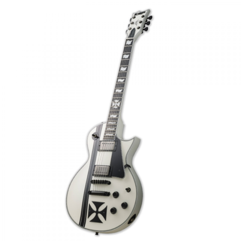 Guitarra assinatura James Hetfield, corpo em Mogno com tampo em Ácer, braço em Mogno colado com perfil fino em U, escala em ébano de 24,75” com 22 trastes XJ, pestana 42mm de osso, carrilhões Sperzel Locking, Ponte Tonepros Locking TOM, pickups activos EMG-JH, hardware negro satinado, parafusos de fixação da correia Schaller, acabamento Satin White decorado, estojo incluído.
