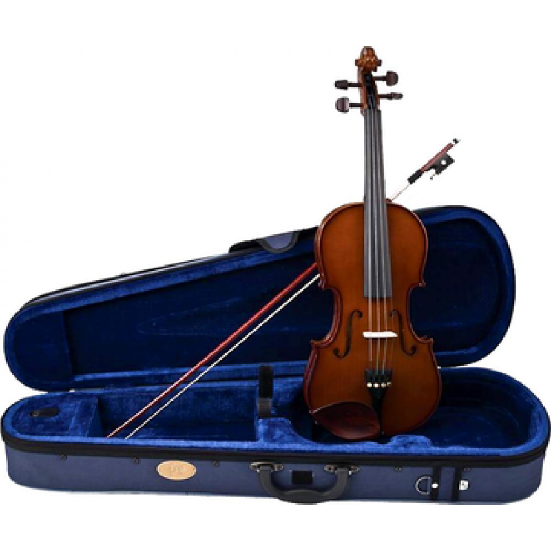 Violino e madeira de Ácer e Abeto maciços, perfil em madeira, guarnição em pausanto, estandarte metálico com afinadores, com arco noz de ébano, resina, e estojo ultraleve forrado com mochilas e dupla bolsa exterior. Instrumento Calibrado.