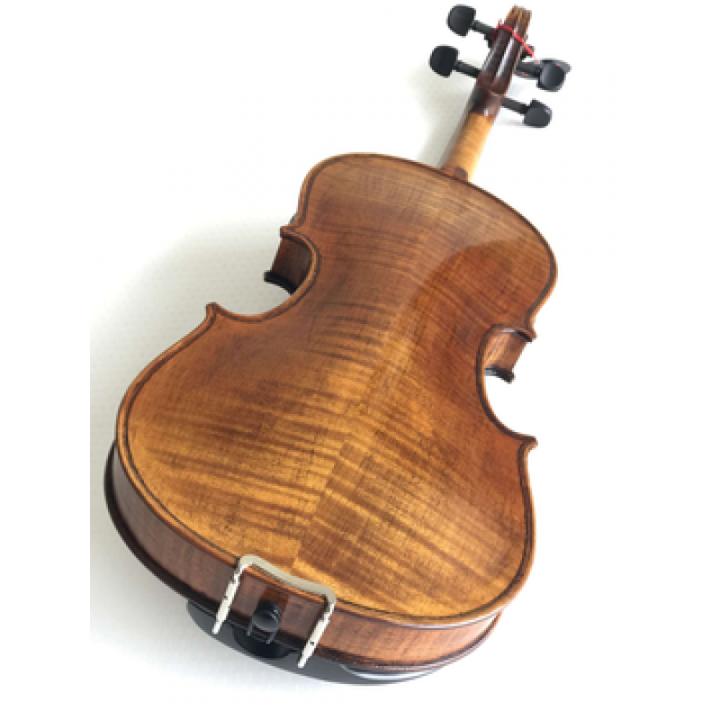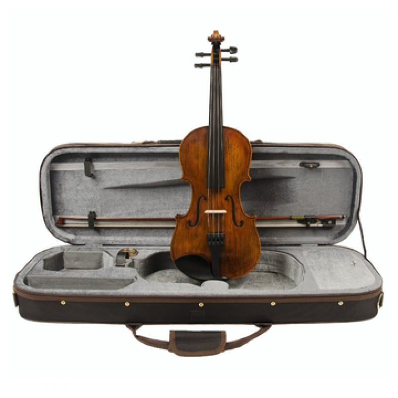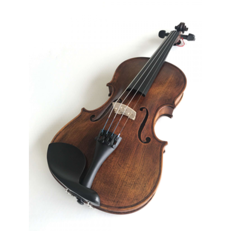 Violino com tampo em madeira de abeto seleccionada, fundo e aros em madeira de Ácer raiada, escala, cravelhas, queixeira e botão em ébano, acabamento antigo, estandarte Wittner Ultra com afinadores, cavalete Aubert, cordas Dogal Vivaldi, estojo rectangular com bolsa para partituras, arco hezagonal com noz em ébano e montado em prata, resina, instrumento calibrado.
