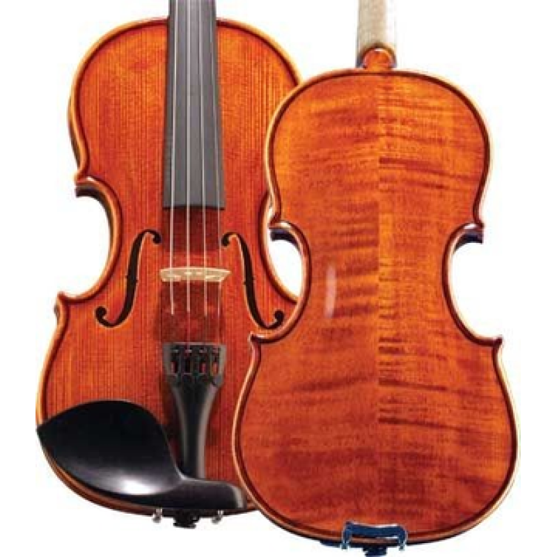 Violino, em madeira maciça, fundo am arce flameado, escala, cravelhas, perfis e queixeira em ébano, estojo e arco incluído.