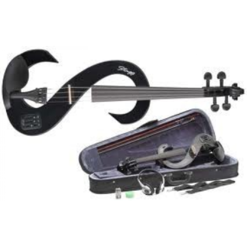 Violino co corpo em acer sólido, ponte e braço em acer. Saídas en jack de 1/4, saída em mini-jack para auscultadores. Equalização de 2 bandas e volume. Inclui estojo, arco, resina e auscultadores. Preto.