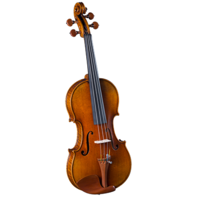 Violino com tampo em abeto maciço envelhecido, traseira e laterais em Maple selecionado, ponte em maple premium, queixeira Guarneri e escala em ébano, cordas Thomastik Dominant, arco octogonal estojo deluxe com higrómetro.